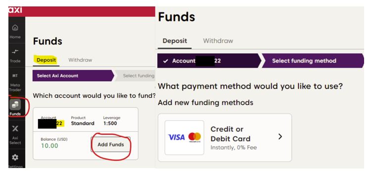 لإيداع الأموال في حساب التداول الخاص بك: سجّل الدخول إلى بوابة عملاء Axi وانتقل إلى قسم ""Funds"" من القائمة الجانبية. اختر ""Deposit"" من القائمة العلوية.