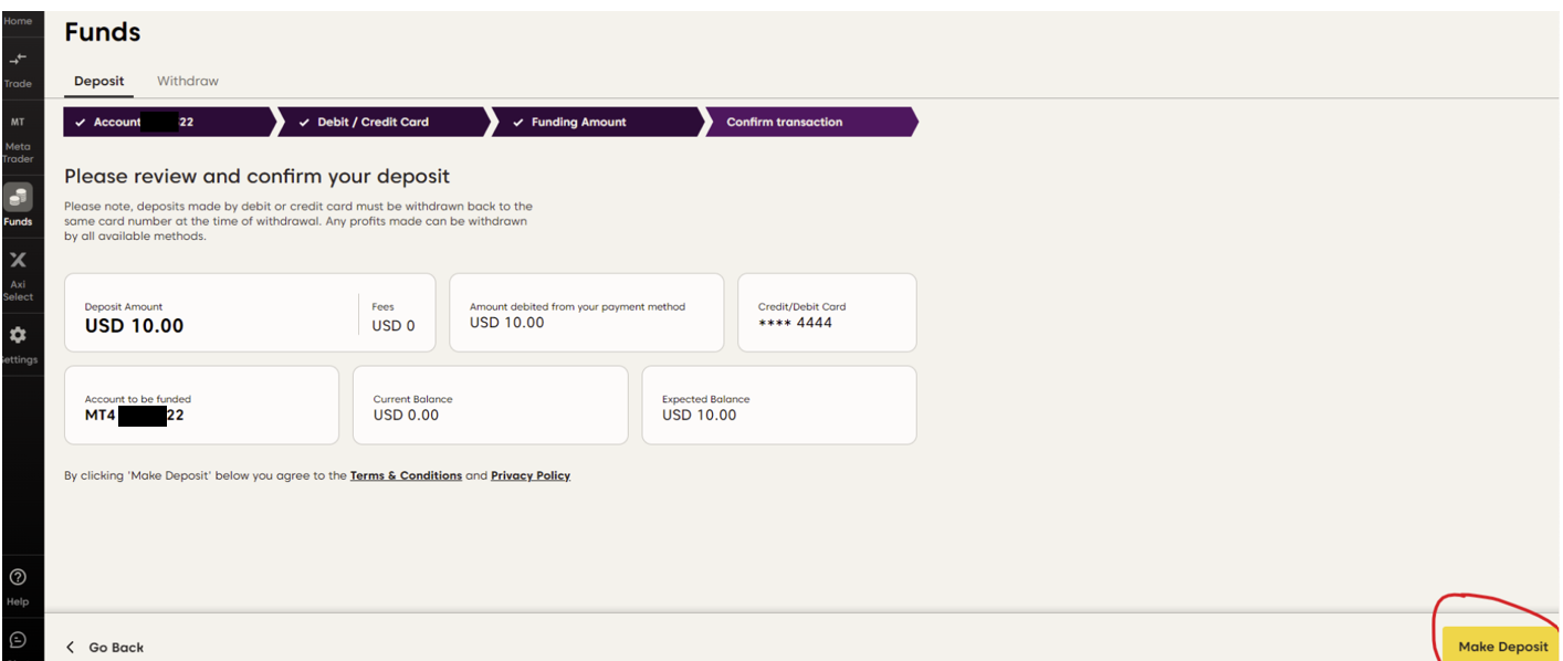 يرجى الملاحظة: عند الإيداع باستخدام البطاقة، يجب أن تكون البطاقة مسجّلة باسمك نفسه المستخدم في حساب Axi. يساعد ذلك على تجنّب أي تأخير في التحقق، حيث نقوم بمراجعة الإيداعات للكشف عن المدفوعات من أطراف ثالثة أو أي نشاط مشبوه.