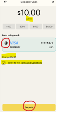 • أدخل المبلغ الذي ترغب في إيداعه، وانتبه إلى العملة التي سيتم تنفيذ المعاملة بها. إذا كانت هذه أول مرة تموّل فيها حسابك، أو إذا كنت ترغب في استخدام بطاقة جديدة، اختر "إضافة بطاقة جديدة".