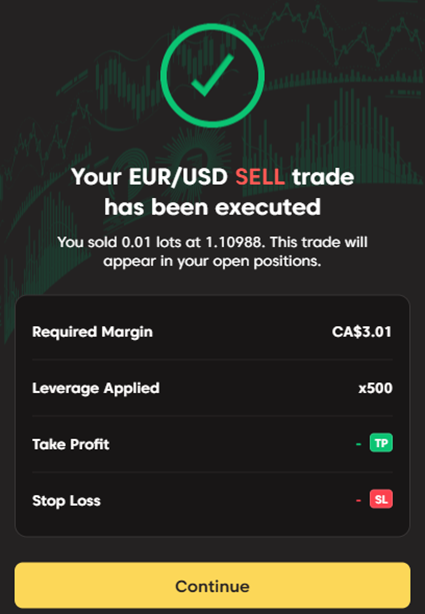 - عند الانتهاء، اضغط على زر "تنفيذ أمر بيع/شراء". ستتلقى رسالة تأكيد عند تنفيذ الأمر، ويمكنك عرض الأمر ضمن صفحة "المراكز".