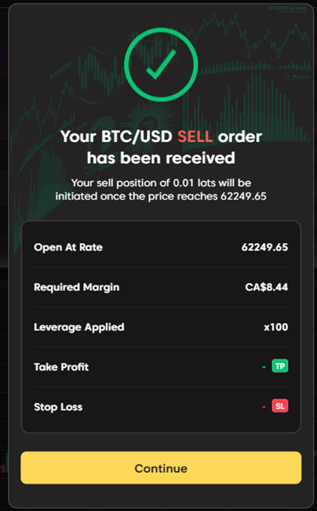 - عند الانتهاء، اضغط على زر "تنفيذ أمر بيع/شراء". ستتلقى رسالة تأكيد عند تنفيذ الأمر، ويمكنك عرض الأمر ضمن صفحة "الأوامر".