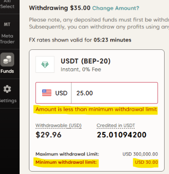 هام: جميع طرق السحب لها حد أدنى مختلف، ويتم عرض هذه الحدود داخل بوابة العملاء. إذا قمت بإدخال مبلغ أقل من الحد الأدنى، فلن تتمكن من متابعة عملية السحب.