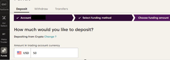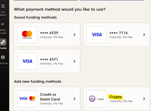 لإيداع الأموال في حساب التداول الخاص بك: سجّل الدخول إلى بوابة عملاء Axi وانتقل إلى قسم ""Funds"" من القائمة الجانبية. اختر ""Deposit"" من القائمة العلوية.