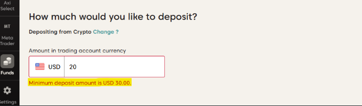 - أدخل المبلغ الذي ترغب في إيداعه. يرجى ملاحظة أن لكل طريقة إيداع حدًا أدنى للمبلغ. إذا أدخلت مبلغًا أقل من الحد الأدنى، فلن تتمكن من إكمال عملية الإيداع.