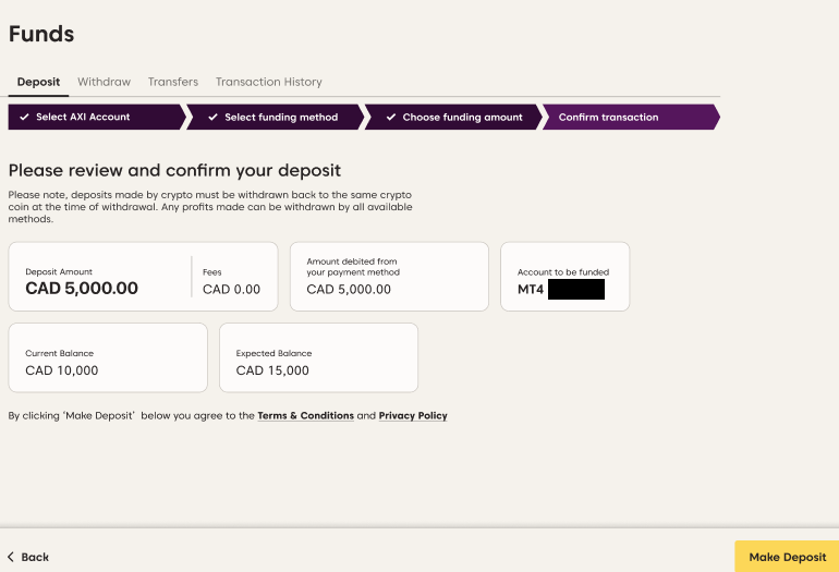 هام: تأكد من اختيار رقم الحساب الصحيح، خاصة إذا كان لديك أكثر من حساب MT4/MT5. في حال الإيداع في الحساب الخاطئ وطلب تحويل داخلي لاحقًا، قد يحدث تأخير بسبب وقت المعالجة.
