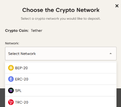 - إذا كانت العملة الرقمية المختارة تتطلب شبكة تحويل، يرجى اختيار الشبكة المناسبة.