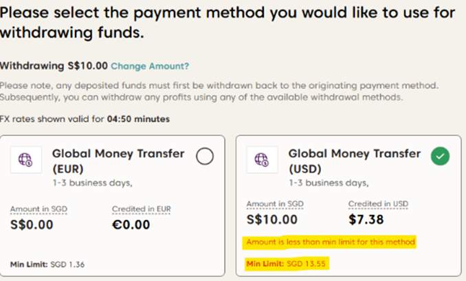هام: جميع طرق السحب لها حد أدنى مختلف، ويتم عرض هذه الحدود داخل بوابة العملاء. إذا قمت بإدخال مبلغ أقل من الحد الأدنى، فلن تتمكن من متابعة عملية السحب. يرجى أيضًا ملاحظة أن الحد الأدنى للسحب يختلف حسب العملة المختارة.