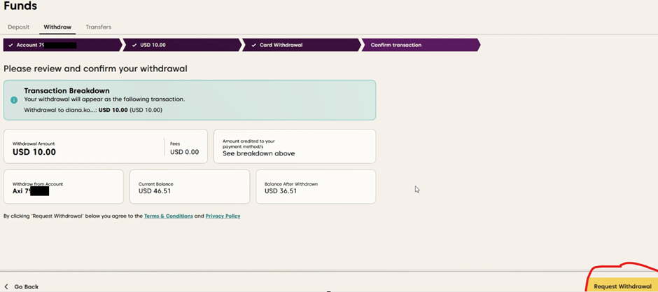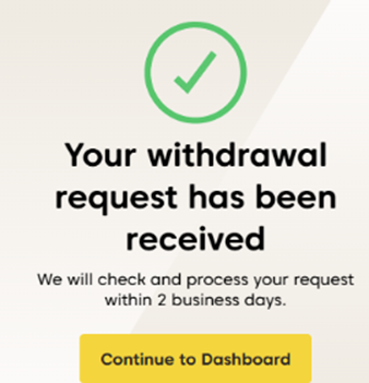 - تحقق مرة أخرى من صحة جميع التفاصيل، ثم اضغط على "طلب السحب" لإرسال الطلب. يرجى العلم بأن معالجة ومراجعة طلب السحب قد تستغرق من يوم إلى يومي عمل.