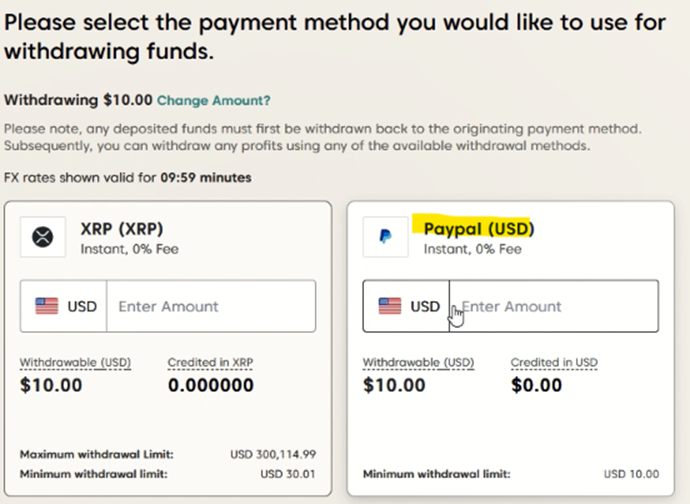 هام: جميع طرق السحب لها حد أدنى مختلف، ويتم عرض هذه الحدود داخل بوابة العملاء. إذا قمت بإدخال مبلغ أقل من الحد الأدنى، فلن تتمكن من متابعة عملية السحب. يرجى أيضًا ملاحظة أن الحد الأدنى للسحب يختلف حسب العملة المختارة.