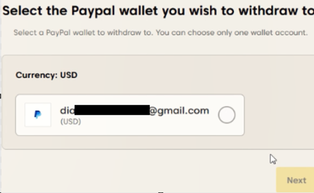 - بعد النقر على "متابعة"، سيُطلب منك اختيار محفظة PayPal الإلكترونية التي سيتم تحويل الأموال إليها. سيتم تحديد المحفظة الإلكترونية باستخدام عنوان البريد الإلكتروني المرتبط بها. يرجى ملاحظة أن البريد الإلكتروني المعروض سيكون هو نفسه الذي استخدمته أثناء عملية الإيداع الأولى. وفقًا لسياسة العودة إلى المصدر (Return to Source)، لا يمكنك السحب إلا إلى نفس عنوان البريد الإلكتروني المستخدم في الإيداع، ولا يُسمح بالسحب إلى بريد إلكتروني مختلف.