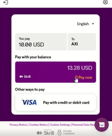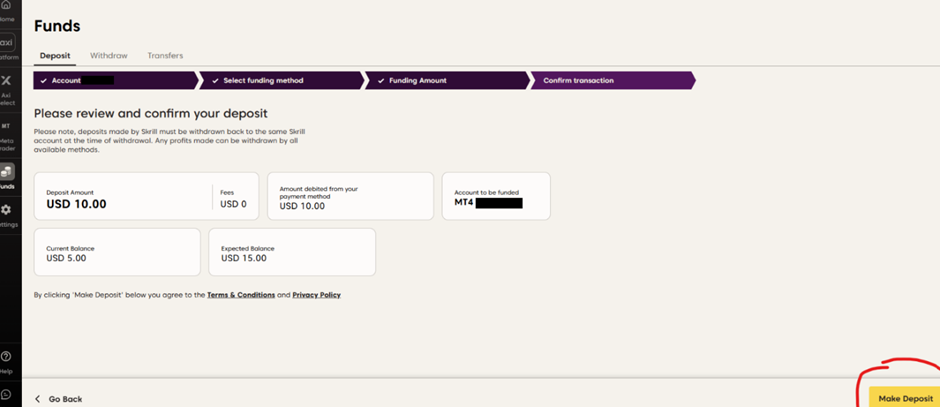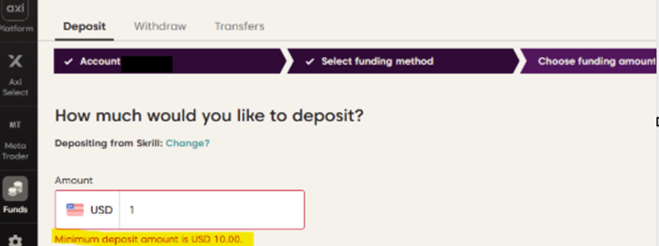 اتبع الخطوات التالية لإيداع الأموال في حساب التداول الخاص بك باستخدام Skrill عبر تطبيق Axi trading platform: