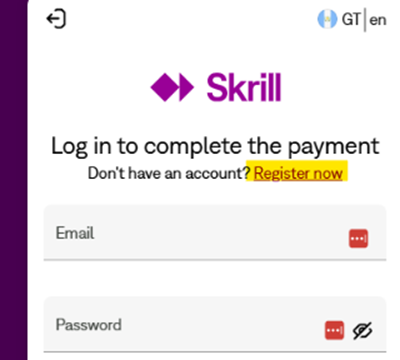 إذا لم يكن لديك حساب Skrill، يمكنك إنشاء حساب مباشرة من البوابة عبر اختيار "سجّل الآن".