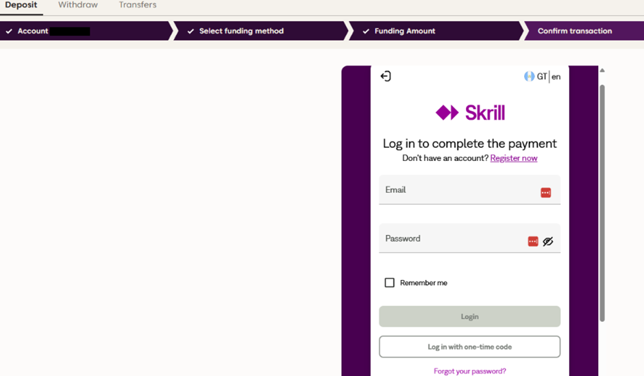 - سيتم توجيهك إلى بوابة الدفع الخاصة بـ Skrill، حيث يمكنك تسجيل الدخول إلى حسابك واستكمال عملية الإيداع.