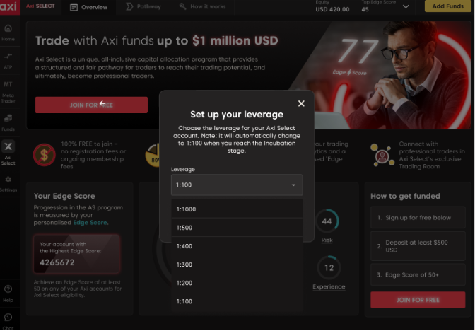 ملاحظة: يمكن تغيير الرافعة المالية في Axi Select فقط خلال مرحلتي قبل التأسيس والتأسيس. اعتبارًا من مرحلة الحضانة وما بعدها، يتم تثبيت الرافعة المالية عند 100:1 ولا يمكن تعديلها.