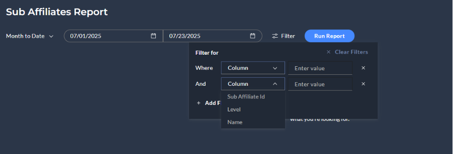 In diesem Bereich können Sie die Provision sehen, die jeder Sub-Affiliate im ausgewählten Zeitraum verdient hat, den Bericht mit Filtern wie Sub-Affiliate-ID, Level oder Name anpassen und falls vorhanden, die Details Ihrer Sub-Affiliates einsehen.