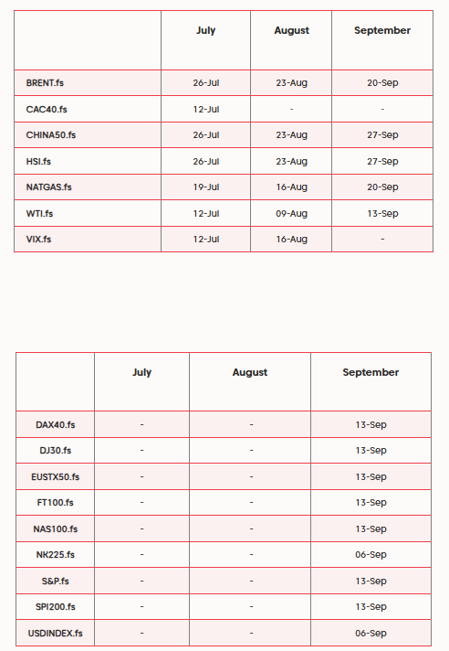 You can view the detailed schedule for upcoming rollovers – including contracts like BRENT.fs, CAC40.fs, WTI.fs, and others – in the rollover table. Below is a general guide for checking this information: