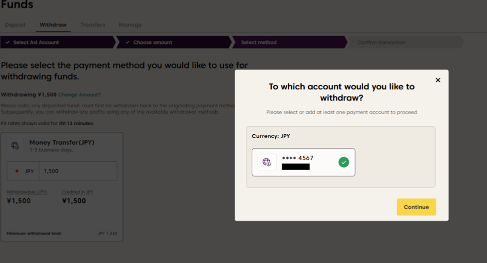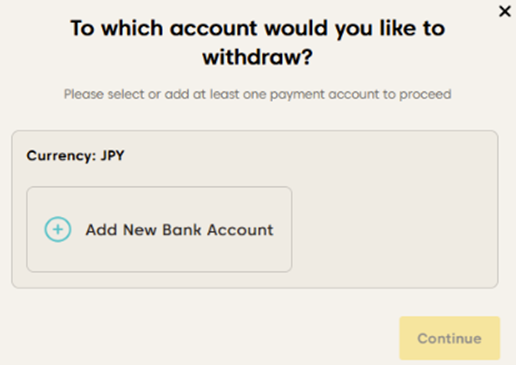 - Select the account you would like to withdraw from and click “Continue”. If you have only one registered bank account, it will be automatically selected for withdrawal.
