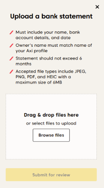 - Upload a clear bank statement or the bank passbook that matches your Axi account name, showing your name, account number, and a date within the last six months, as statements not meeting these criteria will be rejected.