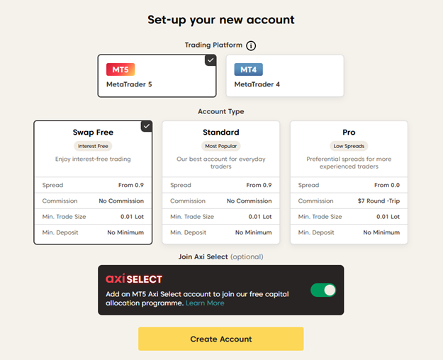 If you reside in one of the eligible regions, you can open a Swap-free account on the Axi Trading Platform by following the steps below: