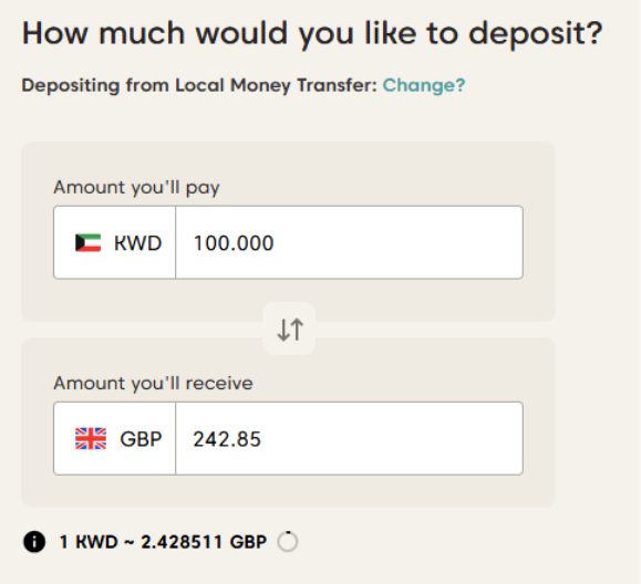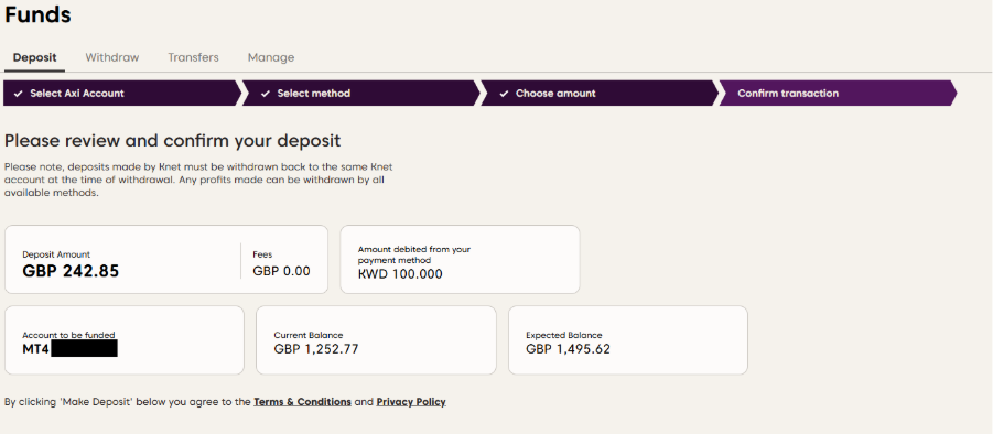 - Enter the deposit amount in KWD (the system will automatically display the equivalent in the other currencies depending which currency is your trading account). Please note: exchange rates update automatically every 10 minutes. This process is system-generated and not controlled by Axi.