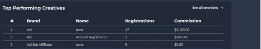 - Axi Sub-Affiliate Link: Helps you introduce new affiliates. It redirects to the affiliate onboarding process and can be shared via any social media platform.