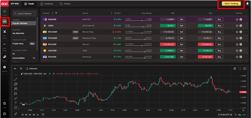 - Once verified, navigate to the Axi Trading Platform and select “Start Trading”.