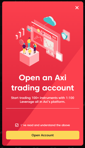 - A pop-up will appear prompting you to open your Axi account, as shown below. Review and agree to the Terms and Conditions, then click “Open Account”.