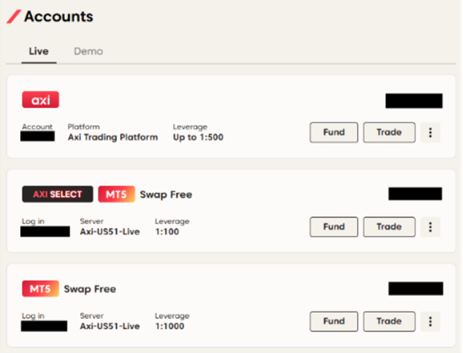 - When the setup is complete, your new Axi trading account will be displayed on your dashboard.