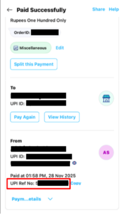 • Once the payment is made, manually enter the payment reference ID (UPI reference number) in the “Enter Transaction ID / UTR No” field.