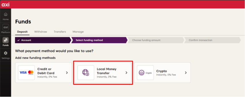 - Select your preferred funding method: “Local Money Transfer”.