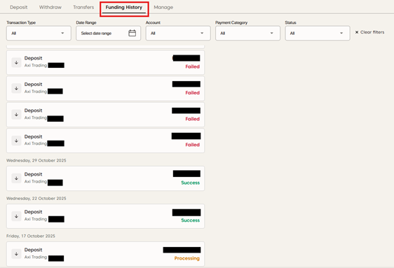 - Internal transfers between accounts are not currently displayed in Funding History. We are working on an update to include this feature.