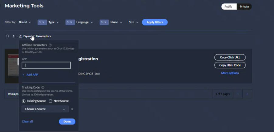 - Copiar URL/Copiar código HTML: Una vez creado el AFP, haz clic en “Copy” para obtener tu enlace de referidos con el AFP incluido.