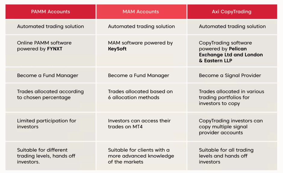 La elección entre una cuenta PAMM y una cuenta MAM depende de las preferencias y necesidades del cliente. Para más información, contacta a tu Gerente de Cuenta o a nuestro equipo de Atención al Cliente.