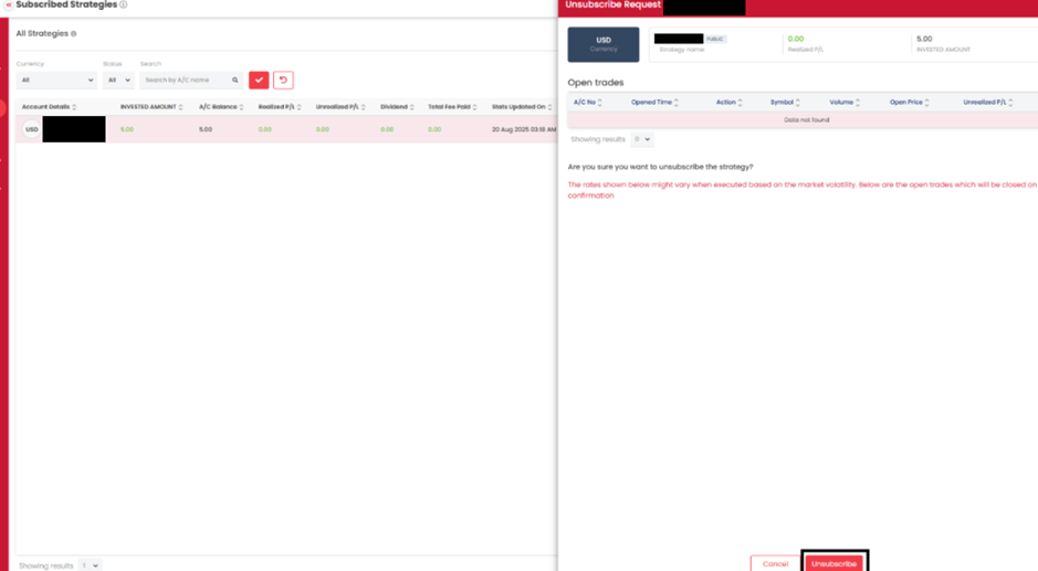 Importante: en un sistema PAMM, los clientes pueden cancelar la suscripción a la estrategia maestra en cualquier momento a través del portal PAMM, y las tarifas de rendimiento se deducirán automáticamente de las ganancias generadas hasta ese momento.