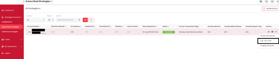 - Recharger votre stratégie PAMM : cliquez sur l’icône en forme de trois points “…” à droite pour afficher des actions supplémentaires et sélectionnez “Ajouter des fonds”.