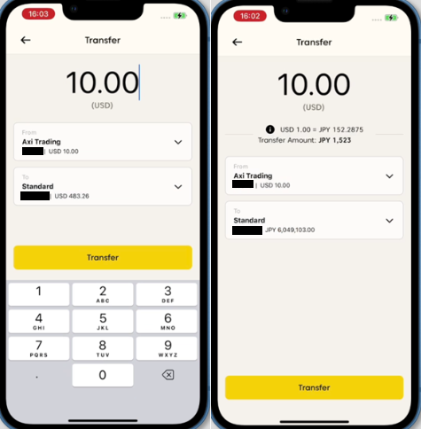 - ट्रांसफ़र राशि डाल दें। अगर सोर्स और डेस्टिनेशन अकाउंटों की करेंसियाँ अलग हैं, तो सिस्टम में आपको कन्वर्शन रेट दिखाई दे जाएगा। अगर दोनों अकाउंटों की एक ही करेंसी है, तो कन्वर्शन रेट की ज़रूरत नहीं पड़ेगी।