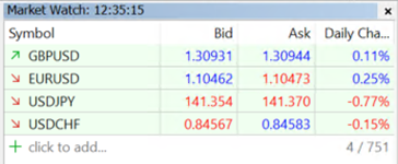 - Market Watch में Symbols के तहत अवेलेबल इंस्ट्रूमेंट्स की लिस्ट दिखाई दे जाएगी।