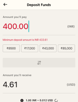 नोट: सुनिश्चित करें कि आप न्यूनतम जमा आवश्यकताओं को पूरा करते हैं। न्यूनतम से कम जमा करने पर लेनदेन पूरा नहीं होगा।