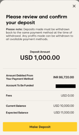 - अगले पेज पर अपने विवरण की समीक्षा करें और "Make Deposit" पर क्लिक करें।