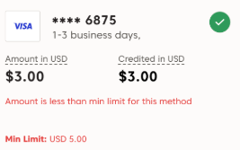 Pilih kartu untuk menerima penarikan Anda. Jika Anda memiliki beberapa kartu, pastikan untuk memilih yang benar dengan memverifikasi 4 digit terakhir. Harap diingat bahwa setiap metode penarikan memiliki jumlah penarikan minimum, yang juga akan ditampilkan di Portal Klien. Untuk penarikan kartu, minimum adalah 5 USD (atau setara). Jika Anda memasukkan jumlah di bawah ini, Anda tidak akan dapat menyelesaikan proses penarikan.