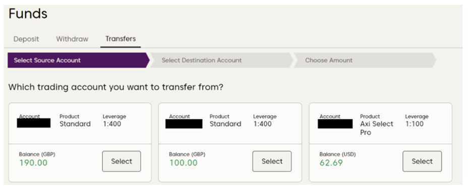 - Pilih akun sumber (misalnya, MT4, Axi Trading, atau Axi Select) dari mana Anda ingin mentransfer dana.
