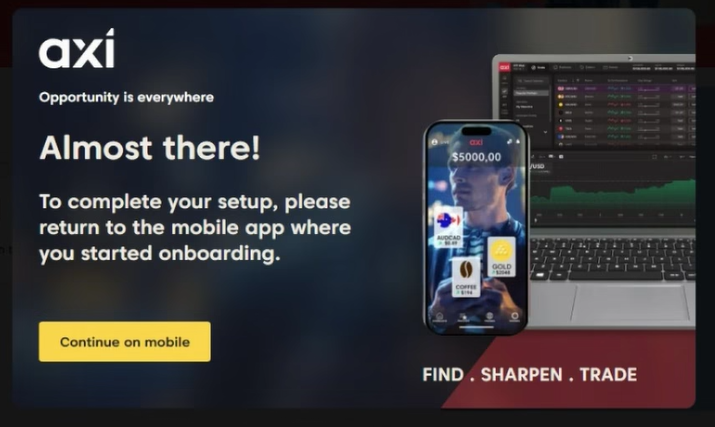 Hal ini terjadi karena pendaftaran perlu diselesaikan di aplikasi tempat awalnya dimulai. Cukup kembali ke aplikasi Axi Trading Platform untuk menyelesaikan langkah-langkah onboarding terakhir.