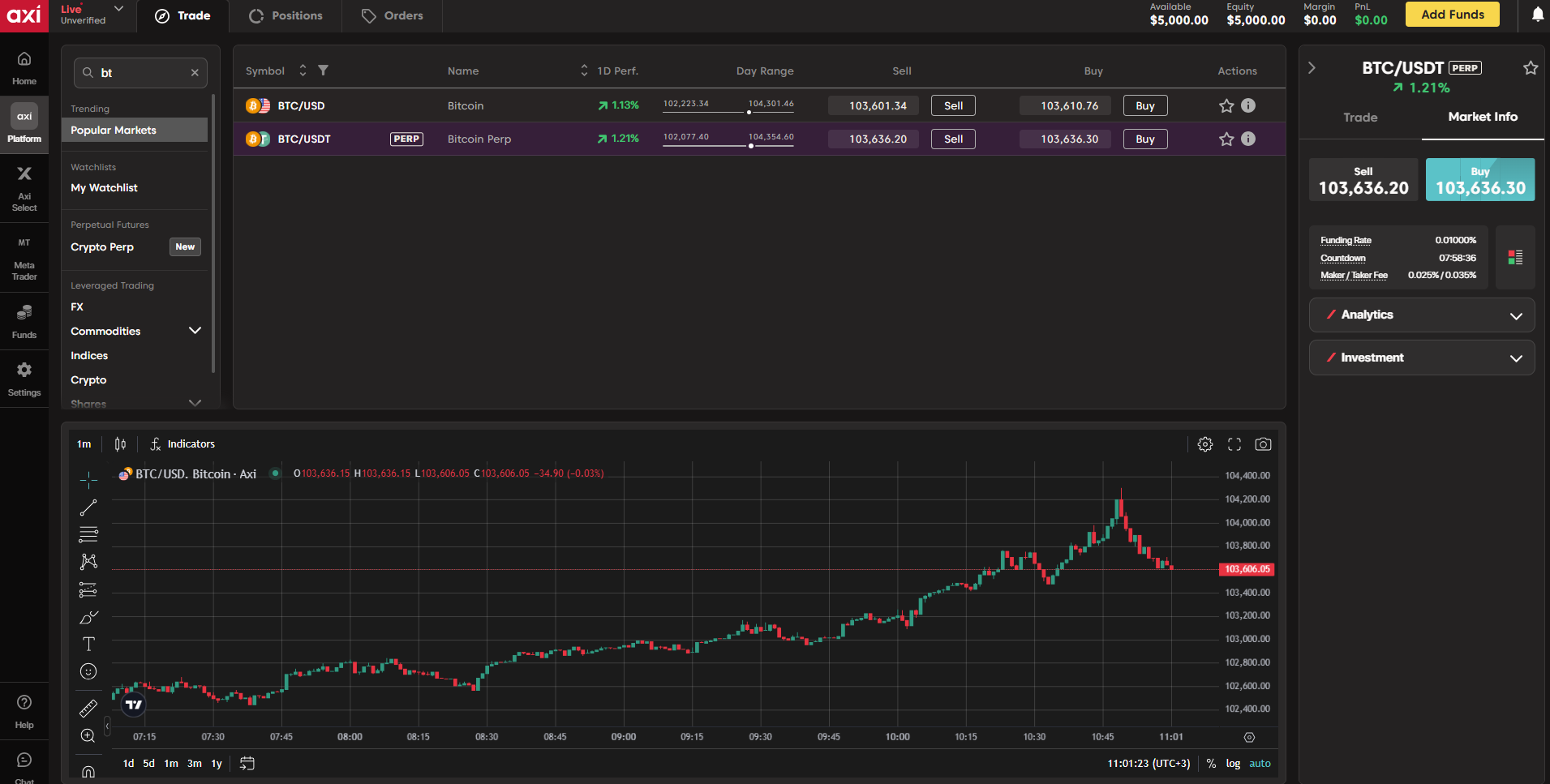Melakukan perdagangan pada Perpetual Future sangat mirip dengan memperdagangkan instrumen lainnya di Platform Web Axi.