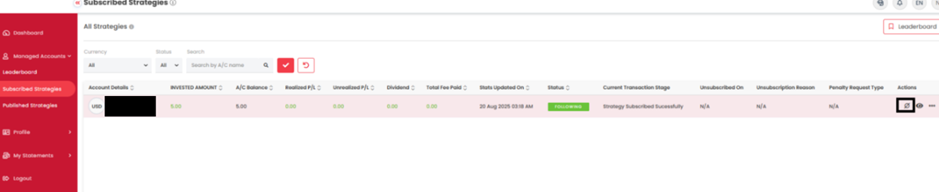 - Torna al dashboard PAMM e visualizza i dettagli della strategia sottoscritta.