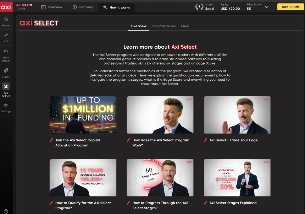 クライアントポータルにログインし、「Axi Select」を選択します。「パスウェイ」セクションに移動します。ここでは、すべてのプログラムフェーズとその条件が表示されます。現在のフェーズはハイライトされており、進捗状況と次のフェーズに進むための条件が確認できます。
