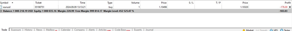 ターミナルウィンドウの取引タブの右側、各注文の横にあるグレーの「閉じる (X)」ボタンをクリックすると、成行注文を決済したり、指値注文を削除したりできます。