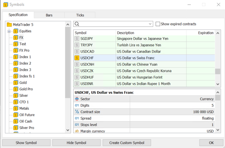 市場が開いている時間と閉まっている時間を知ることは、あなたの取引に重要な影響を与えます。個々の取引金融商品の取引可能時間を表示するには、MT5にログインし、取引する商品を右クリックして、「仕様」 を選択します。すると、市場の営業時間など、その金融商品に関する詳細情報を表示できます。