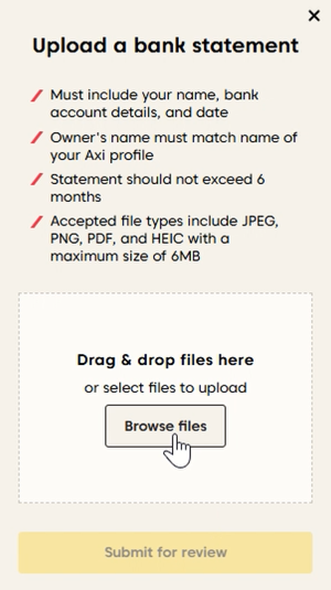 - Axiアカウント名と一致する明確な銀行明細書をアップロードしてください。明細書には、お名前、口座番号、および過去6ヶ月以内の日付が記載されている必要があります。これらの要件を満たさない明細書は拒否されます。