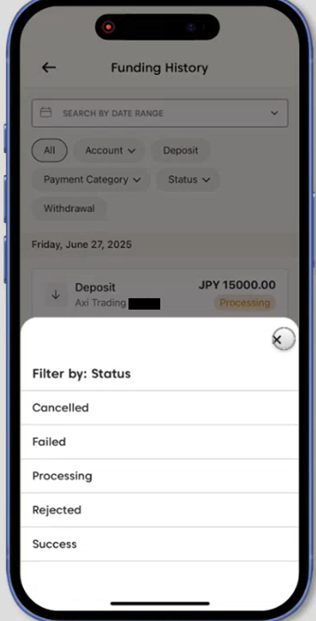 - 入金または出金のステータス(例:キャンセル、失敗、処理中、拒否、成功)