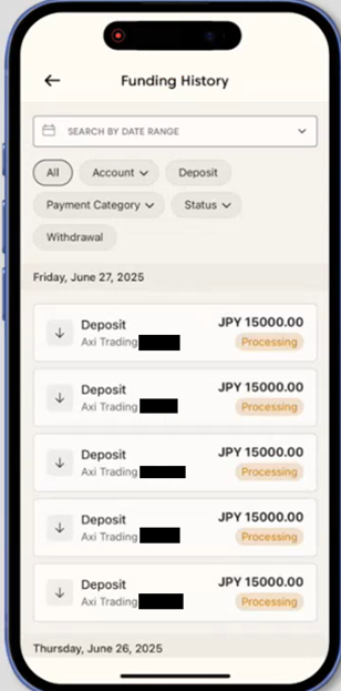 はい、Axi取引プラットフォームアプリを使って、ライブ口座とデモ口座の両方の資金履歴を確認できます。